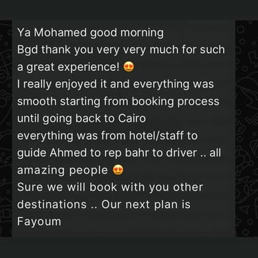 We are an Egyptian-owned travel company creating authentic Egypt adventures for travelers from around the globe. Our passion is showcasing the country's most incredible destinations, with a special focus on unique experiences in Dahab, Fayoum, and Siwa. From solo explorers to group tours, we provide expert local guides and tailored itineraries, ensuring every journey with us is safe, seamless, and truly unforgettable.